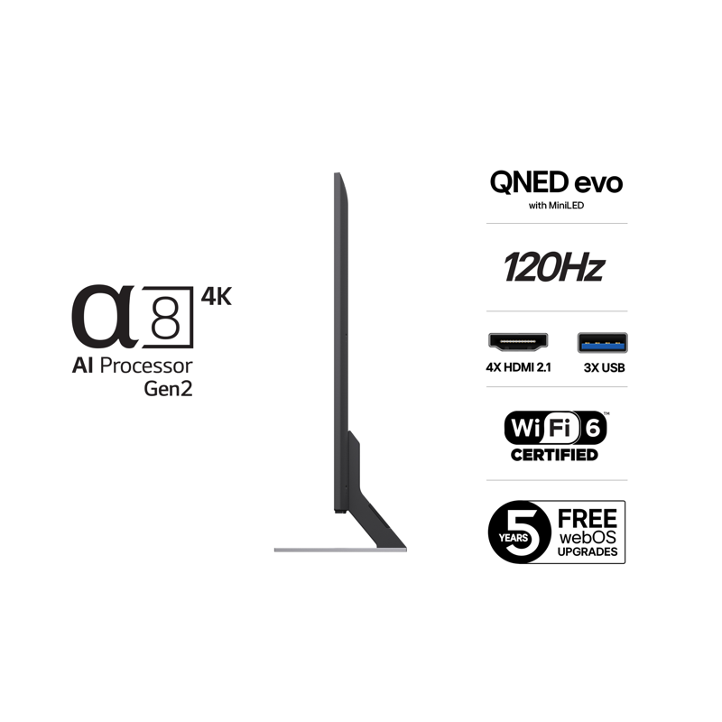 LG QNED 85 tarjoaa upeat värit, syvän kontrastin ja mukaansatempaavan kuvan QNED evo -teknologialla ja Dynamic Tone Mapping Pro -toiminnolla. α8 AI Processor 4K -prosessori optimoi jokaisen ruudun, ja Dolby Vision sekä Dolby Atmos -läpivienti tarjoavat elokuvateatterimaista erinomaisuutta. webOS-käyttöjärjestelmän, Magic Remote -kaukosäätimen ja saumattoman älylaitteiden integroinnin ansiosta televisio on suunniteltu viihdettä, pelaamista ja arjen helpottamista varten.