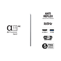 Pelaajille suunnitellussa OLED G5 -televisiossa on 165 Hz:n G-Sync- ja FreeSync-tuki, joka poistaa kuvan repeämisen ja tekee liikkeestä silkinpehmeää. LG:n Game Optimizer- ja Dashboard-toimintojen avulla voit hienosäätää asetuksia reaaliajassa parhaan suorituskyvyn takaamiseksi. Salamannopea 0,1 ms:n vasteaika ja alhainen viive antavat kilpailuetua, kun taas henkeäsalpaavat OLED-kuvat tekevät jokaisesta maailmasta mukaansatempaavamman.
