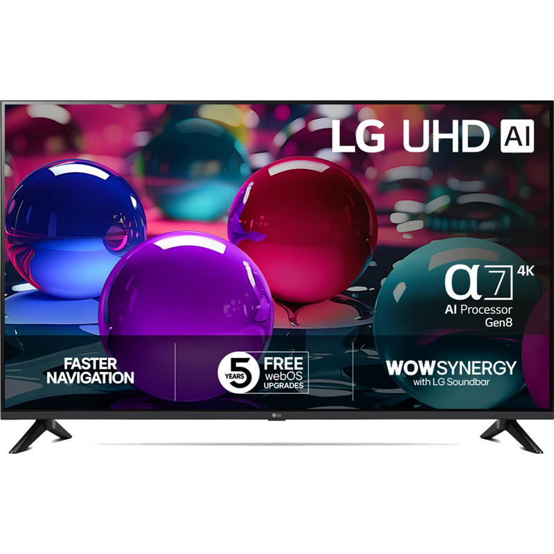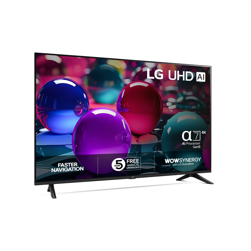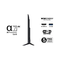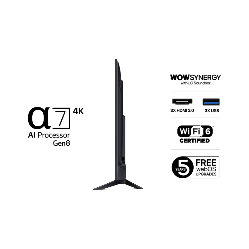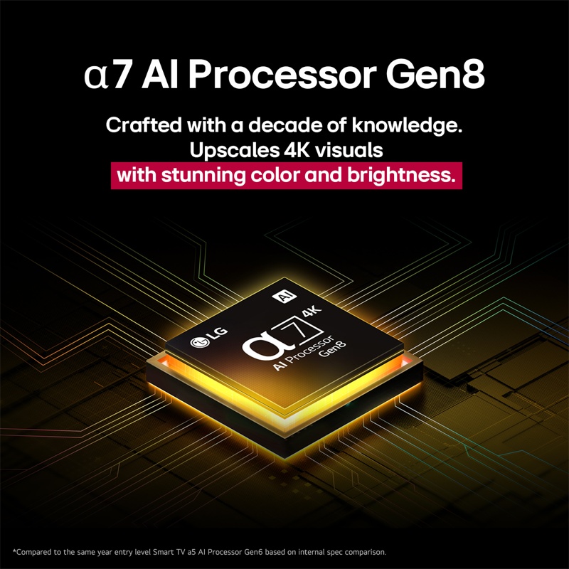 - Terävä kuva, sujuva suorituskyky ja helppo striimaus 4K HDR -tarkkuuden, päivitetyn α7 AI -prosessorin ja webOS-räätälöinnin ansiosta