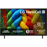 Koe todenmukainen kuva NanoCell-tarkkuudella. NANO80 tarjoaa terävän ja todenmukaisen kuvan NanoCell-värinparannuksen, 4K HDR10 -tuen ja α7 AI Processor 4K Gen8 -prosessorin ansiosta. Se on upean monipuolinen televisio jokapäiväistä viihdettä varten webOS-käyttöliittymän ja monien älykkäiden toimintojen ansiosta.