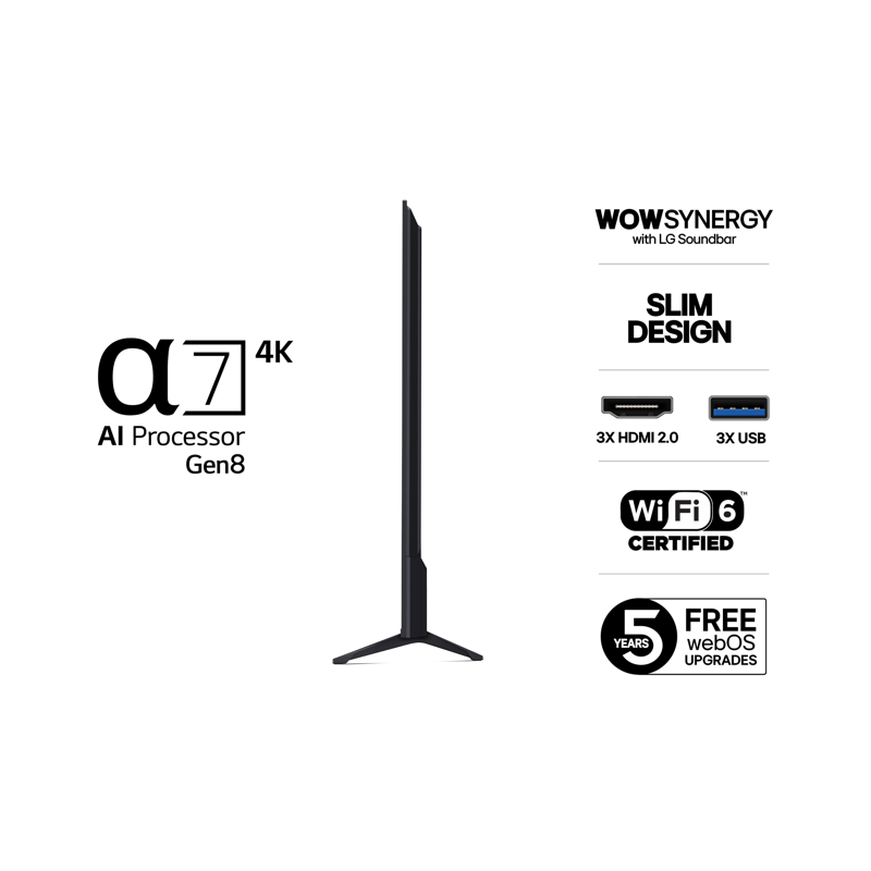 - Terävä kuva, sujuva suorituskyky ja helppo striimaus 4K HDR -tarkkuuden, päivitetyn α7 AI -prosessorin ja webOS-räätälöinnin ansiosta