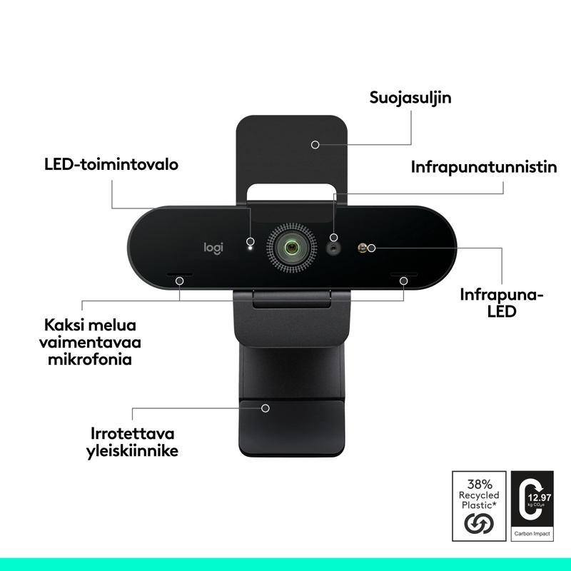 Brio 4K:n avulla keskustelut kuulostavat selkeiltä ja luonnollisilta. Kaksi ympärisäteilevää mikrofonia sieppaavat äänen jopa noin metrin etäisyydeltä, kun taas aktiivinen melunvaimennus auttaa keskittymään ja takaa saumattoman yhteistyön vaimentamalla häiritsevää taustahälyä.