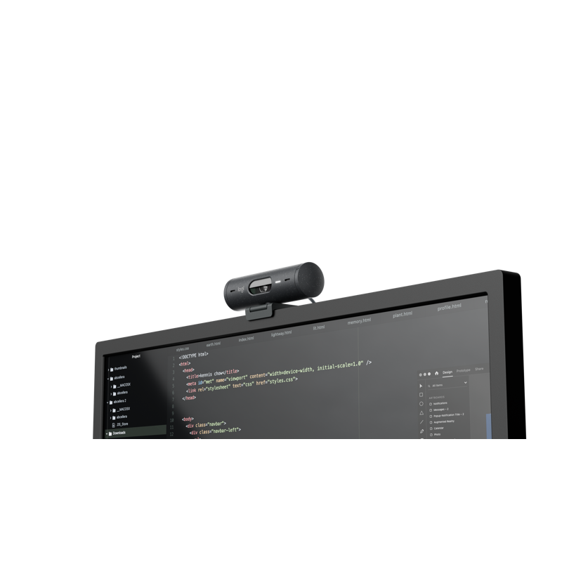 Brio 500 -web-kameran Show Mode -tilan avulla voit kallistaa kameraa alas ja esitellä luonnoksia, keskeneräisiä töitä ja muita esineitä työpöydälläsi. Mukana tulevassa telineessä on mikro-imutyyny, joka kiinnittää verkkokameran näytön takaosaan. Näin voit tehdä nopeita säätöjä yhdellä kädellä. Lataa Logi Tune ilmaiseksi ottaaksesi Show Moden käyttöön.