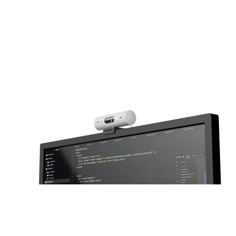 Brio 500 -web-kameran Show Mode -tilan avulla voit kallistaa kameraa alas ja esitellä luonnoksia, keskeneräisiä töitä ja muita esineitä työpöydälläsi. Mukana tulevassa telineessä on mikro-imutyyny, joka kiinnittää verkkokameran näytön takaosaan. Näin voit tehdä nopeita säätöjä yhdellä kädellä. Lataa Logi Tune ilmaiseksi ottaaksesi Show Moden käyttöön.
