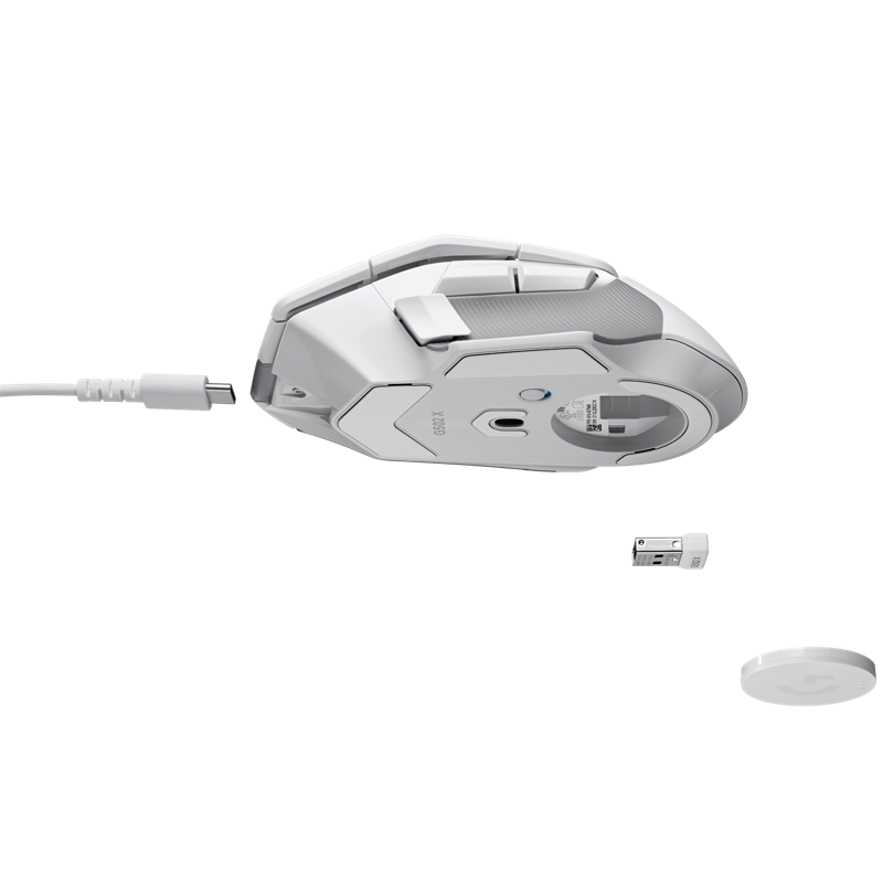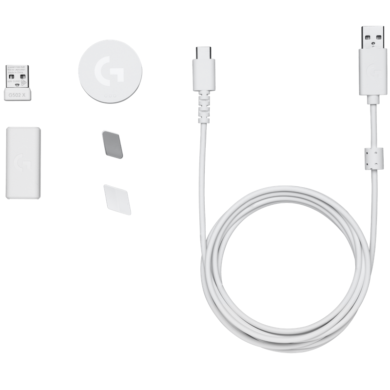 Langaton G502 X LIGHTSPEED -pelihiiri, DPI-vaihtopainikkeen kansi, USB-C- latausjohto, LIGHTSPEED-USB-A-vastaanotin, USB-jatkojohto, käyttäjän dokumentaatio, tarra.