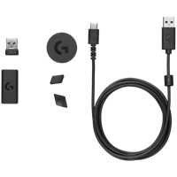 Langaton G502 X PLUS LIGHTSPEED -pelihiiri, DPI-vaihtopainikkeen kansi, USB-C- latausjohto, LIGHTSPEED-USB-A-vastaanotin, USB-jatkojohto, käyttäjän dokumentaatio, tarra.