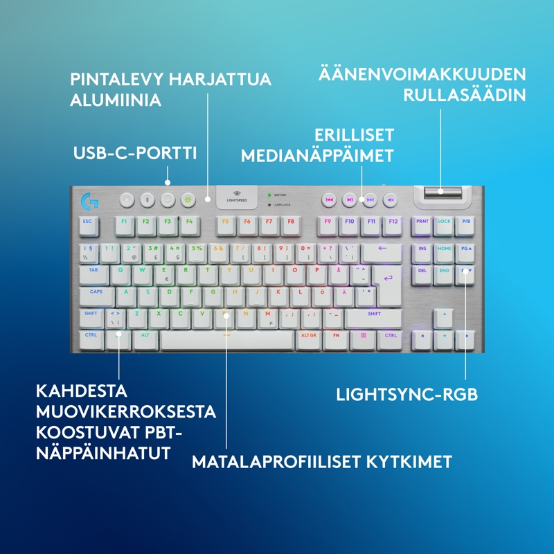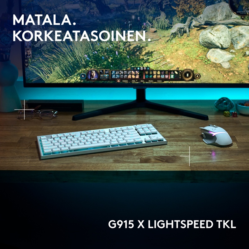 Kompakti Logitech G915 X LIGHTSPEED TKL -pelinäppäimistö sisältää peliteknologian viimeisimpiä innovaatioita – siro muotoilu ja seuraavan sukupolven tekniikka parantavat pelaamista kaikilla tasoilla.