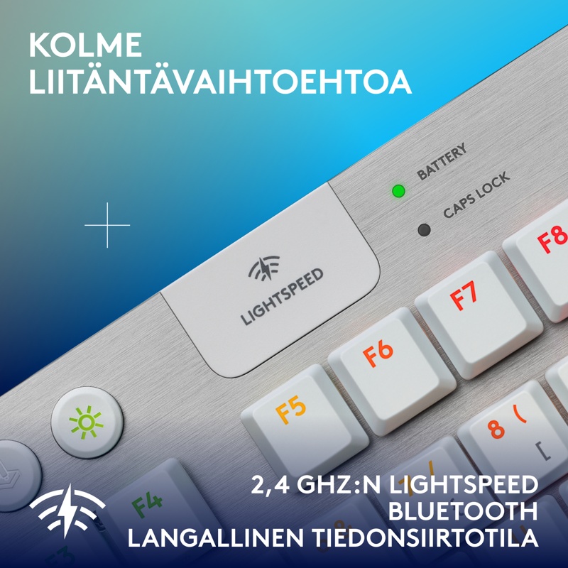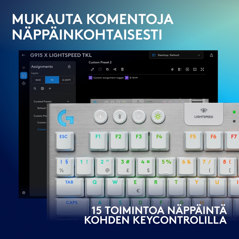 Huolellisesti suunniteltu matalaprofiilinen langaton G915 X LIGHTSPEED TKL -pelinäppäimistö sisältää uusimpia peliteknologian innovaatioita ja huolella valikoituja materiaaleja. Kolme liitäntävaihtoehtoa – luokkansa paras 2,4 GHz:n langaton LIGHTSPEED, Bluetooth ja langallinen tiedonsiirtotila. Määritä KEYCONTROLilla jopa 15 ominaisuutta näppäintä kohden. Huolellisesti muotoillut matalaprofiiliset GL-kytkimet tuovat lisää APM:ää ja nopeutta.