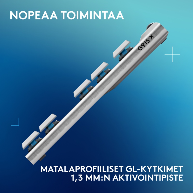 Nopeus, tarkkuus ja mukavuus matalaprofiilisilla mekaanisilla GL-kytkimillä. Lisää APM nopeutta (toimintoja minuutissa) 1,3 mm:n aktivointipisteellä ja näppäinpainallusten 3,2 mm:n kokonaismitalla.