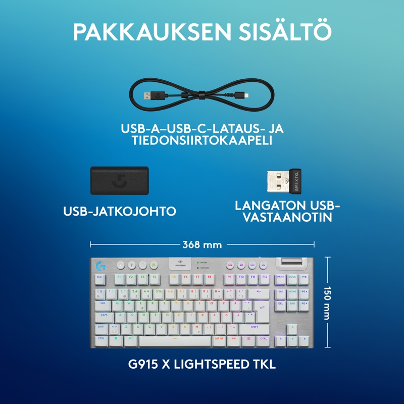 Logitech G915 X Lightspeed TKL -näppäimistö, LIGHTSPEED-USB-vastaanotin, USB-jatkojohto, USB-C-tiedonsiirto/-latausjohto, käyttäjän dokumentaatio