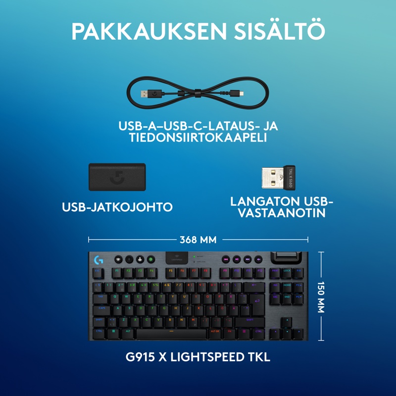 Logitech G915 X Lightspeed TKL -näppäimistö, LIGHTSPEED-USB-vastaanotin, USB-jatkojohto, USB-C-tiedonsiirto/-latausjohto, käyttäjän dokumentaatio