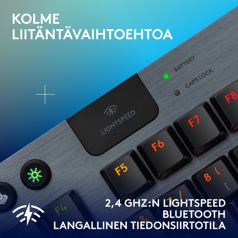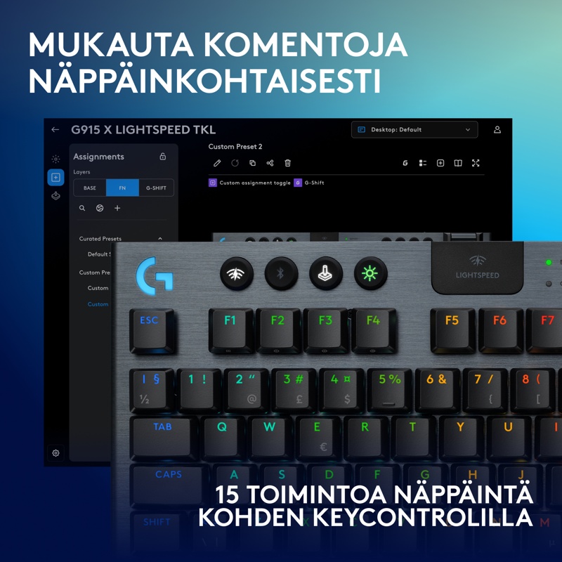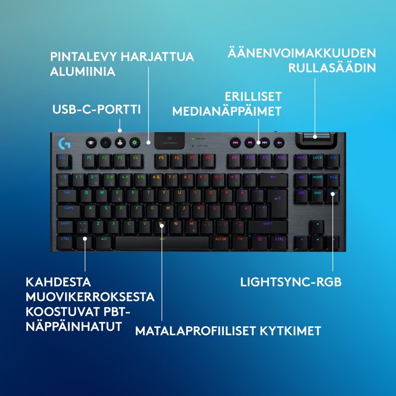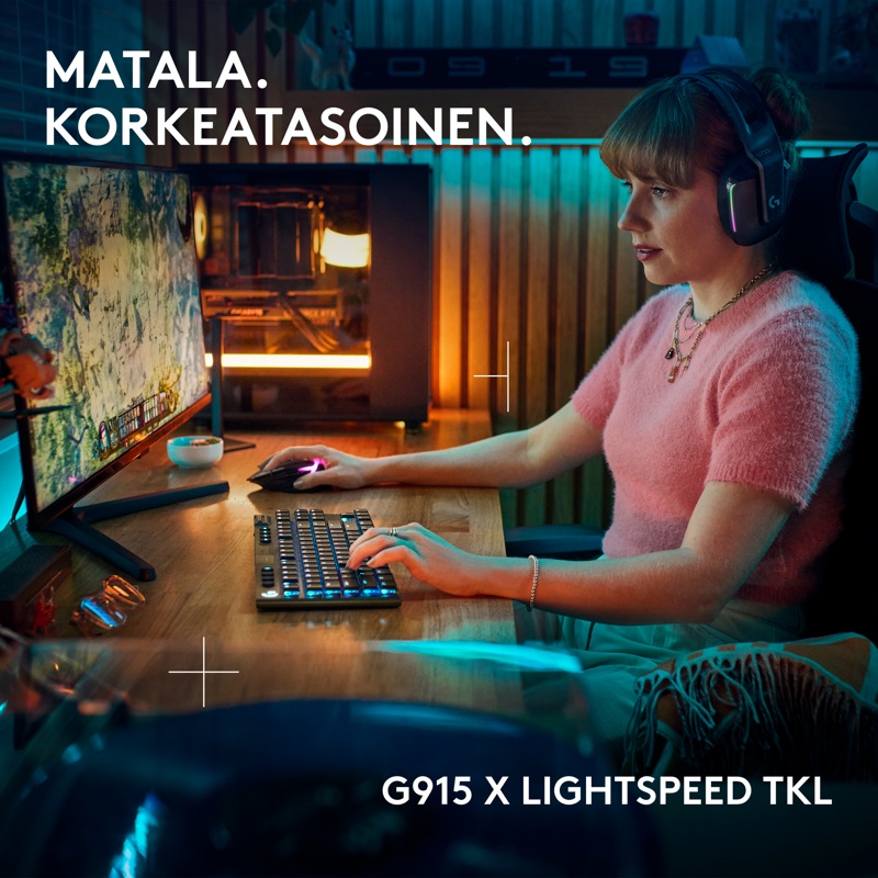 Kompakti Logitech G915 X LIGHTSPEED TKL -pelinäppäimistö sisältää peliteknologian viimeisimpiä innovaatioita – siro muotoilu ja seuraavan sukupolven tekniikka parantavat pelaamista kaikilla tasoilla.