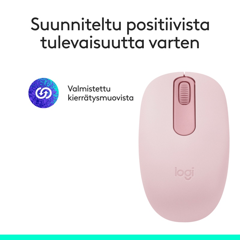 Tehty kestämään, valmistettu kierrätysmuovista: M196- hiiren muoviosat sisältävät sertifioitua kuluttajakäytön jälkeen kierrätettyä muovia (67 % grafiitinharmaassa ja 66 % luonnonvalkoisessa hiiressä).