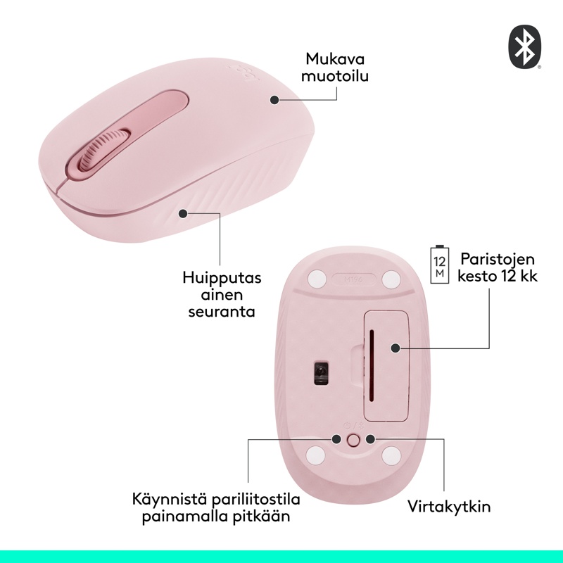 Elämää ilman johtoja ja sotkuja – M196 on edullinen Bluetooth-hiiri, jonka paristo kestää jopa 12 kuukautta ja jonka avulla voit muodostaa pariliitoksen muutamassa sekunnissa ja työskennellä vaivatta. Pienikokoinen hiiri on valmistettu kierrätysmuovista*, ja sen kaareva muoto takaa käyttömukavuuden.