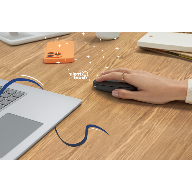 Pebble Mouse 2 M350s -hiiren Silent Touch -tekniikka poistaa 90 % napsautusäänistä, joten voit jatkaa napsautusta ilman häiriötekijöitä.