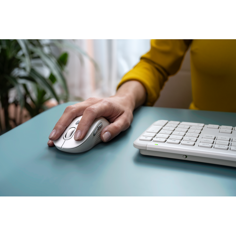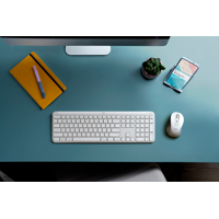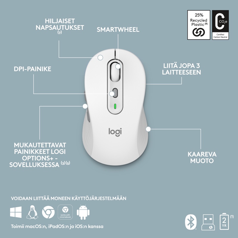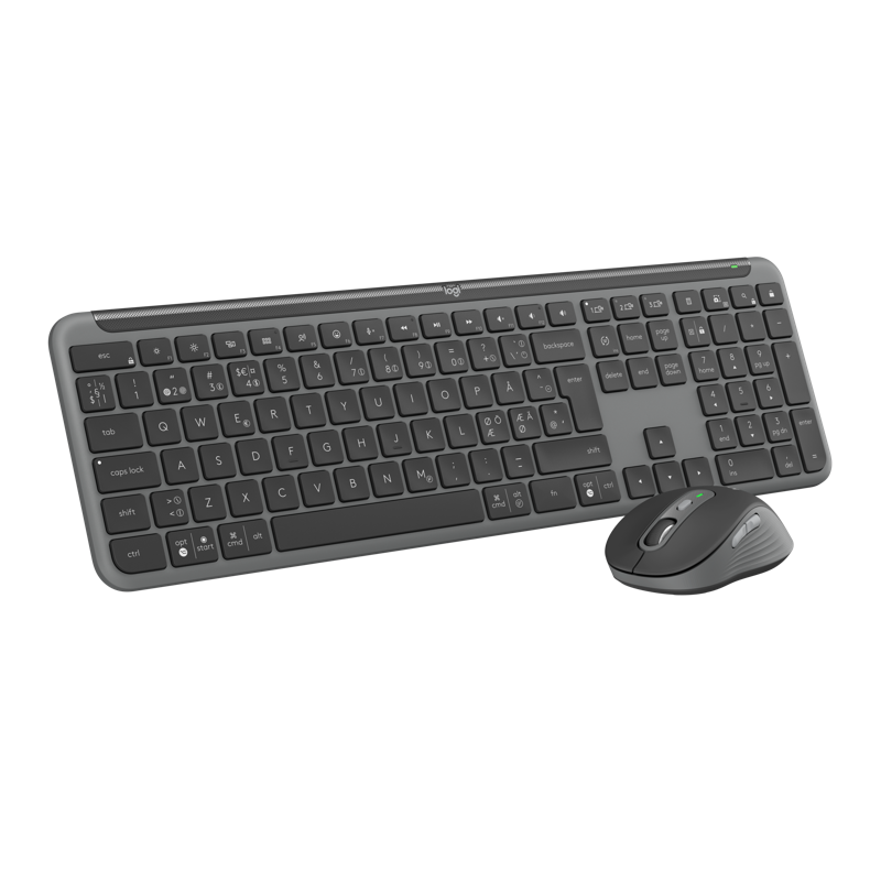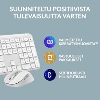 Kirjoita ja napsauta eri tietokoneilla vaivatta Signature Slim MK950 - näppäimistöllä ja -hiirellä, jotka tekevät työelämästä taianomaista tehokkailla mukautuksilla ja pikanäppäimillä. Täysikokoisen Signature Slim Keyboard K950 -näppäimistön siro muotoilu ja laadukas rakenne nostavat minkä tahansa työpöydän tasolle. Sitä täydentää Signature Plus Mouse M750 ja sen mukava kaareva muoto – mikä tekee siitä upean, kierrätysmuovista valmistettuyhdistelmän. Hiljainen kirjoittaminen ja napsauttelu niin näppäimistöllä kuin hiirellä auttavat sinua keskittymään ja aiheuttavat vähemmän häiriöitä muille. Hiiren SmartWheel-vieritysrullan avulla vierität sivuja ja asiakirjoja nopeasti ja tarkasti. Voit käyttää näppäimistöä ja hiirtä useammalla laitteella sekä käyttöjärjestelmällä – vaihda kannettavan tietokoneen, tabletin ja puhelimen välillä. Yhdistä näppäimistö ja hiiri langattomasti Bluetoothilla tai mukana tulevalla Logi Bolt -USB-vastaanottimella.