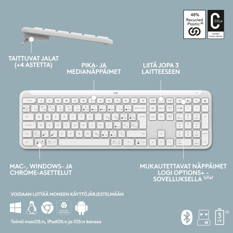 - Langattomalla näppäimistöllä kirjoita saumattomasti tietokoneella, tabletilla ja älypuhelimella käyttäen yhtä näppäimistöä