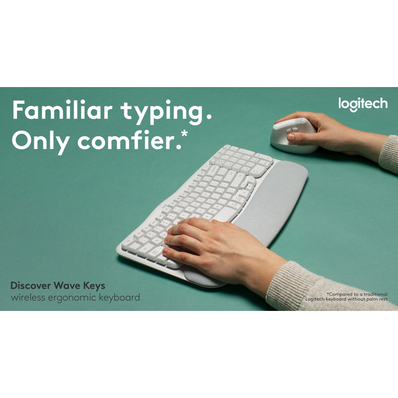 Sujuviin työpäiviin, tunne aalto. Langaton ergonominen Wave Keys -näppäimistö on muotoiltu niin, että se tuntuu heti tutulta ja pitää kirjoitusasennon luonnollisena koko päivän. Pehmustettu muodon muistava kämmentuki antaa ranteillesi tukea koko päivän ajan.