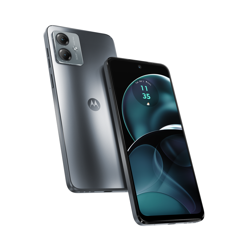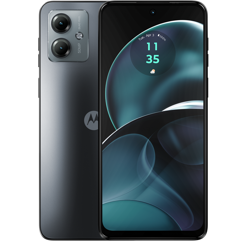 Motorola g14, laturi, USB-C-kaapeli, pikaopas, SIM-työkalu, suojakotelo