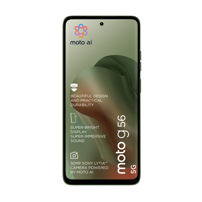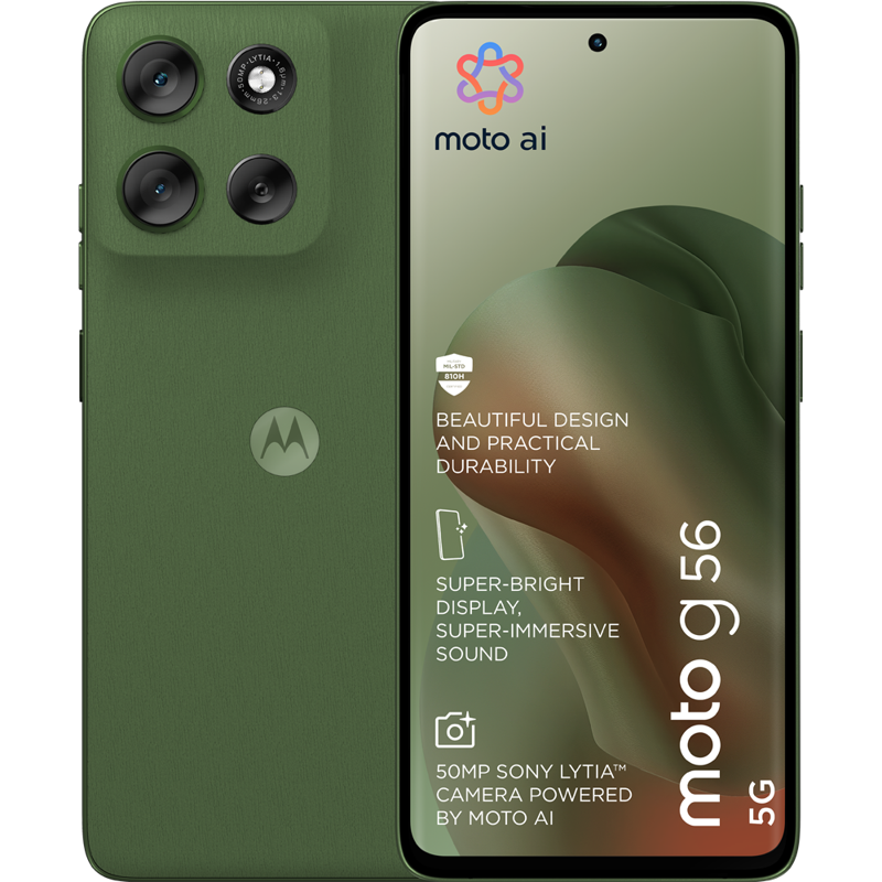 Esittelyssä moto G56 5G – yhdistelmä kaunista muotoilua ja käytännöllistä kestävyyttä. Nauti pehmeästä, käteen sopivasta premium-viimeistelystä sekä vedenkestävyydestä, äärilämpötilojen sietokyvystä ja naarmuuntumattomasta näytöstä. Uppoudu viihteeseen erittäin kirkkaalla 6,72” FHD+ -näytöllä ja tehokkailla stereokaiuttimilla, joissa on Bass Boost. Ota upeita kuvia missä tahansa valossa 50 MP Sony LYTIA -kameralla, jota tehostaa moto ai. Saat tuntikausia virtaa vain muutamassa minuutissa TurboPower-pikalatauksella. Koe 5G-nopeudet kahdeksanytimisellä suorittimella. Lisäksi saat runsaasti tallennustilaa kuville, elokuville, musiikille ja sovelluksille. Uusi moto G56 5G. Kestävyys on kaunista.