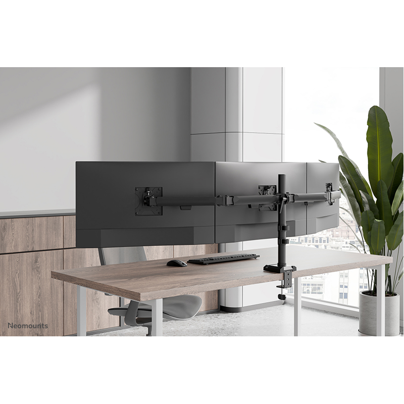 Neomounts DS60-600BL3 NERO -näytönvarsi on erinomainen valinta kaikille, jotka etsivät tukevaa ja monipuolista ratkaisua kolmelle enintään 27" näytölle, joiden paino on enintään 6 kg per näyttö. Täysin liikuteltava näytönvarsi tarjoaa maksimaalisen joustavuuden monipuolisten kallistus- (90°), kierto- (360°) ja kääntöominaisuuksiensa (180°) ansiosta, mikä mahdollistaa optimaalisen katselukulman löytämisen ergonomista työasentoa varten.