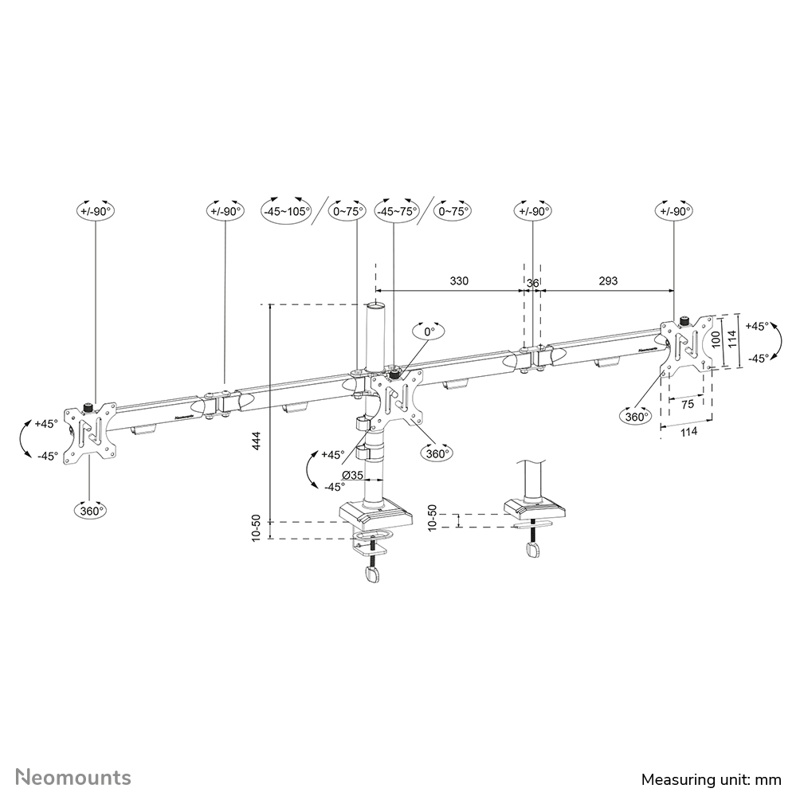DS60-600BL3 sopii näytöille, joissa on 75x75 tai 100x100 mm VESA-kiinnityskuvio. Epästandardeihin kiinnityskuvioihin Neomounts tarjoaa erillisiä VESA-sovitelevyjä. Näyttöjen täydellistä kohdistusta varten varressa on mikrosäätötoiminto.