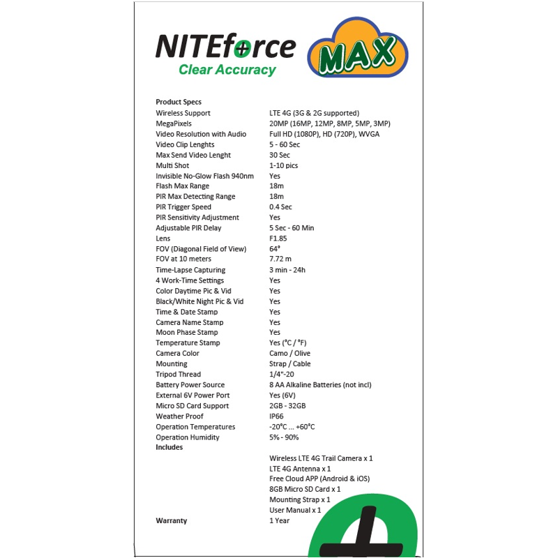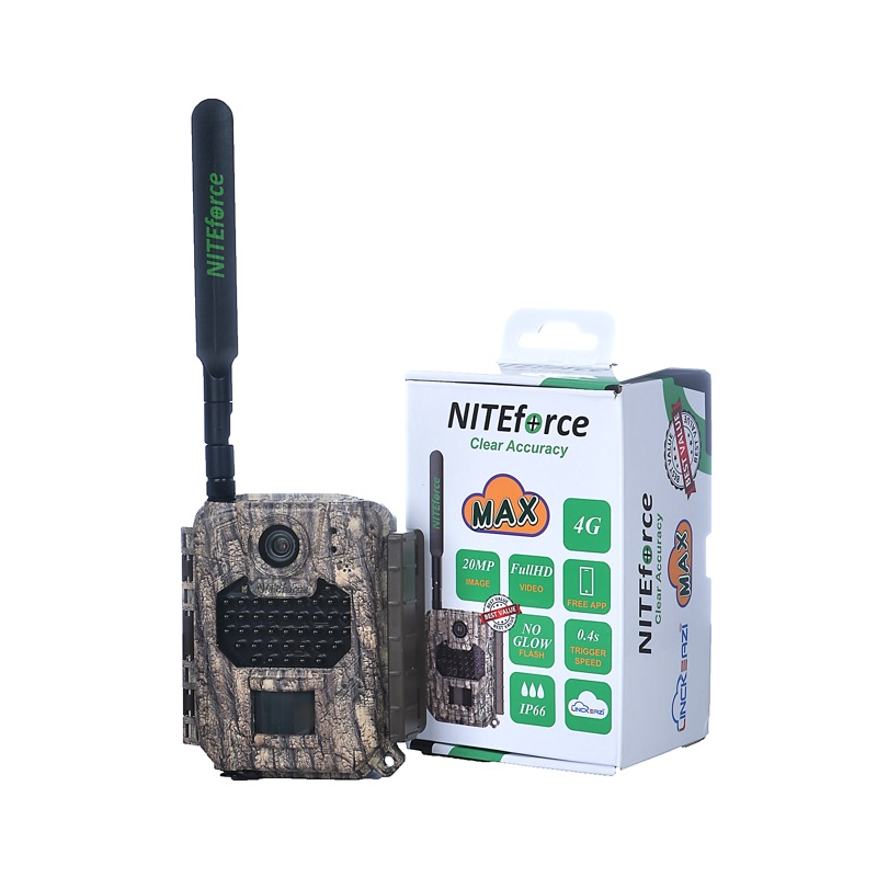 NITEforce MAX -riistakamera lähettää alkuperäiset kuvat ja videot nopealla 4G-yhteydellä. Kuvat ja videot tallentuvat ilmaiseen LinckEazy-sovellukseen, jonka avulla voit vaihtaa etänä kameran asetuksia ja etäohjata kameraa ilmaiseksi. Kamera lähettää maksimissaan 30 sekunnin pituiset videot äänen kera. Kuvat ja videot liikkuvat nopealla 4G-yhteydellä. NITEforce MAX soveltuu erinomaisesti riistakamerakäyttöön tai valvontakäyttöön. Se lähettää kaiken materiaalin kohteesta nopeasti ja hyvälaatuisena. Nopea tiedonsiirto ja huippulaatuinen kuvamateriaali on ehdoton edellytys, mikäli kameraa käytetään esimerkiksi valvontaan valvontakamerana mökillä. Pienikokoinen riistakamera piiloutuu maastoon ja ympäristöön helposti.