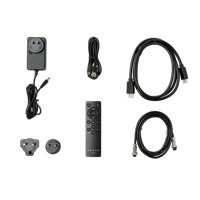 Pika-aloitusopas, virtalähde, kaukosäädin ja paristot, 4-johtiminen kaiutinkaapeli (2 m), HDMI-kaapeli (1,5 m), USB Type-C - USB Type-A -kaapeli (1,5 m), kaiutinjalustat