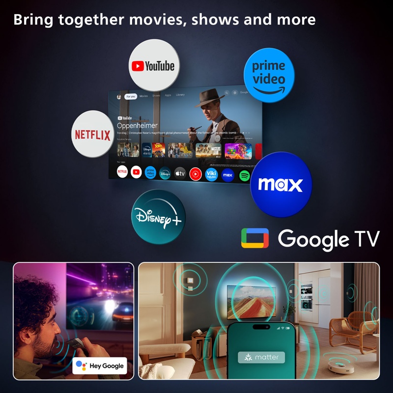 Saumaton yhteensopivuus Matterin kanssa tarkoittaa, että voit integroida 4K Ambilight TV:n valmiiseen älykotiverkkoosi helposti. Kaukosäätimellä voi myös ohjata satelliitti- tai kaapelivastaanotinta tai käynnistää Google Assistantin. Televisio on yhteensopiva myös Alexa-laitteiden ja Apple AirPlayn kanssa.