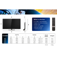 Kaukosäädin, 1 x litiumioniakku, 1 USB-C -kaapeli kaukosäätimen lataamiseen, pöytäjalusta, virtajohto, pikaopas, laki- ja turvallisuusesite