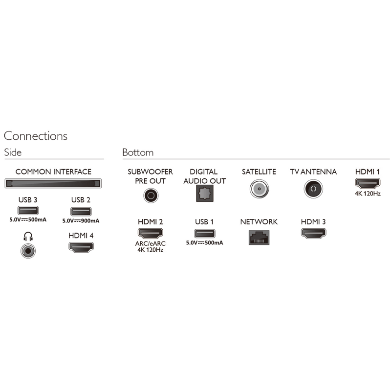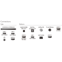 Common Interface Plus (CI+), Digitaalinen äänilähtö (optinen), Ethernet-LAN RJ-45, Kuulokelähtö, Satelliittiliitin, Palveluliitäntä