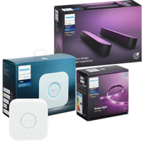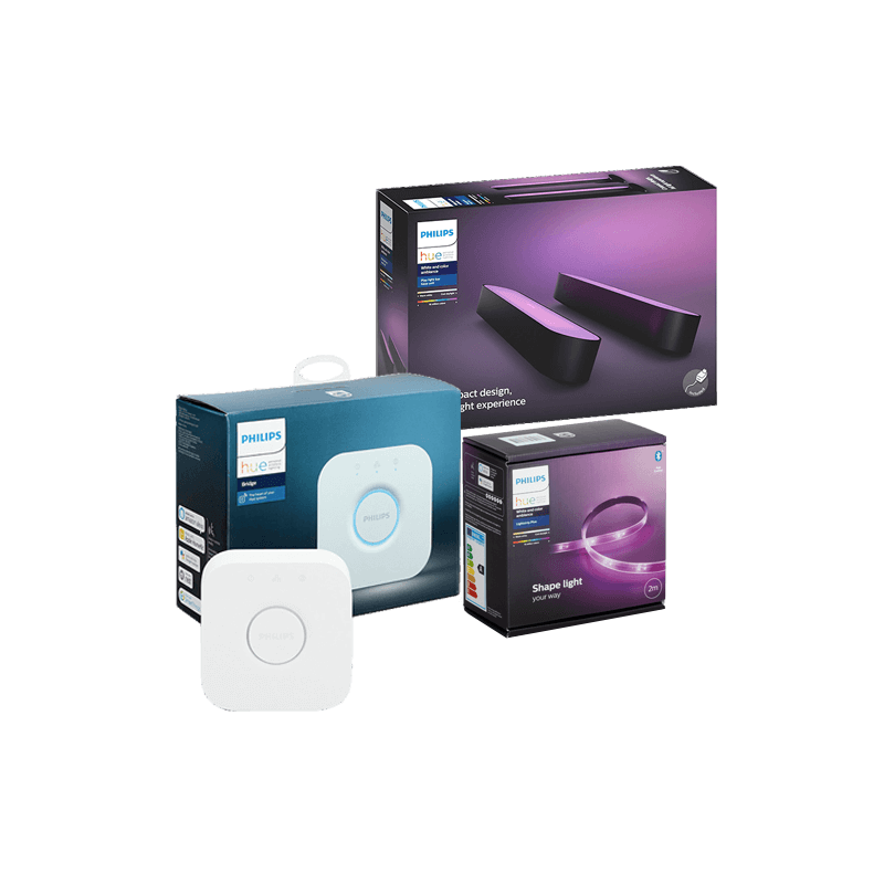 - Tuotepaketti sisältää Hue Bloom -korostusvalaisimen, Lightstrips -valonauhan ja Hue Bridge -sillan