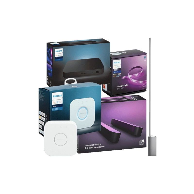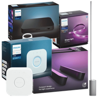- Tuotepaketti sisältää 2 kpl Hue Play -valopalkkia, Signe-lattiavalaisimen, Lightstrips -valonauhan, Hue Bridge -sillan ja HDMI Sync Boxin