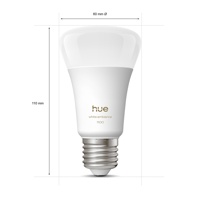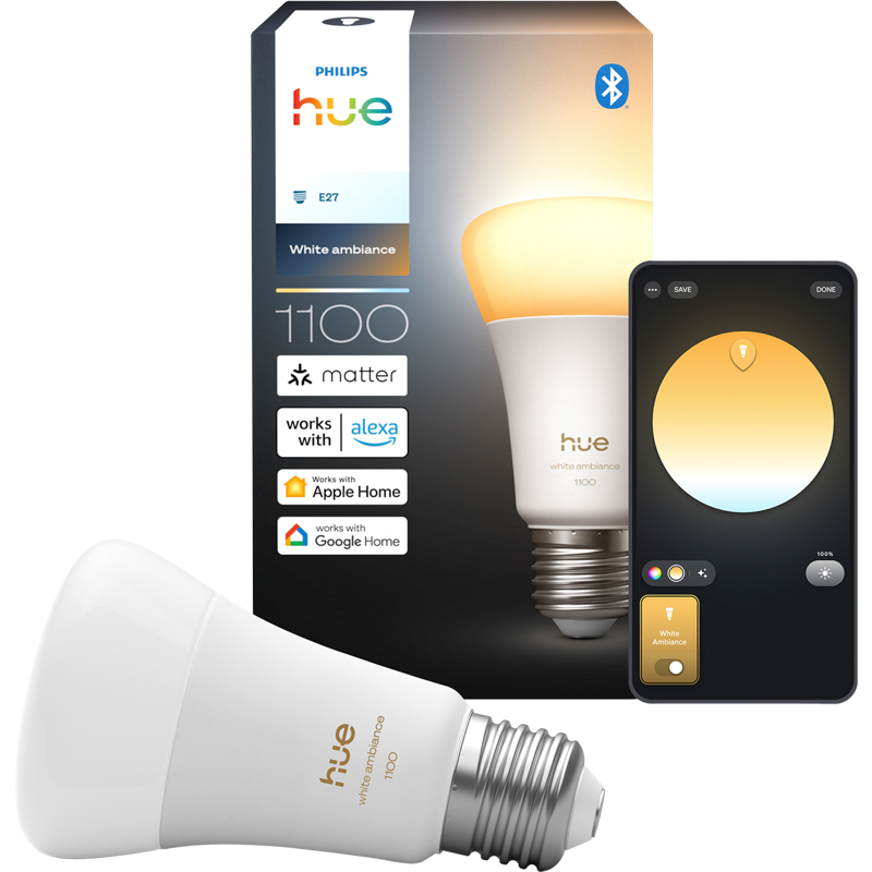 Tässä Philips Hue White ambiance A60-älylampussa on E27-kanta. Huen White ambiance -sarjan tuotteissa on integroitu himmennys, ja valon valkoisen valon sävyä voidaan vaihtaa lämpimästä viileään. Sävyä ja kirkkautta voidaan säätää helposti Hue-sovelluksessa, älytarvikkeilla tai kodin virtuaaliavustajilla. Valon maksimikirkkaus on 1 100 luumenia, ja se voidaan himmentää jopa 0,2 % kirkkaustasolle, joten voit asettaa valon käyttötarpeeseen sopivaksi. Kokeile valmiita valaistusasetuksia tai dynaamisia valotehosteita, kuten kultaista valoa hehkuvaa Kynttilänvaloa, luodaksesi viihtyisää tunnelmaa. Lisää kokoonpanoosi Bridge, niin saat käyttöösi kaikki Hue-järjestelmän ominaisuudet.
