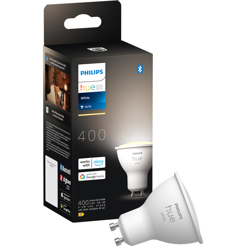 - Philips Hue GU10 -lampuissa on sama kanta kuin muissa GU10-lampuissa, joten voit lisätä älyvalaistuksen ominaisuuksia sinulla jo oleviin kohdevalaisimiin!