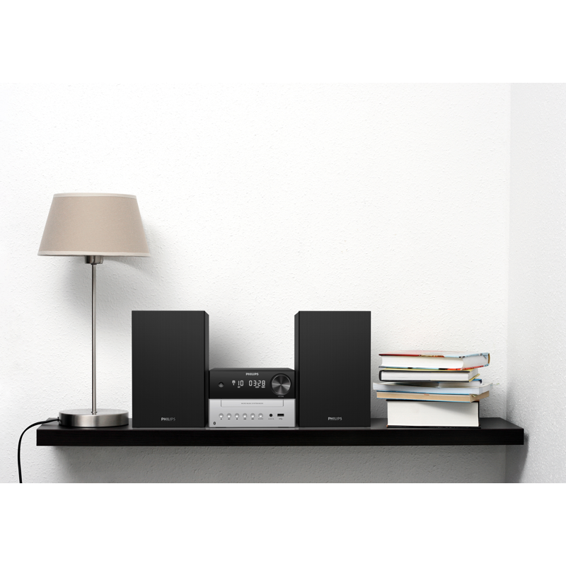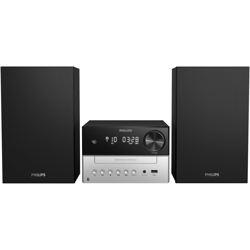 Tyylikkäällä M3205-mikromusiikkijärjestelmällä voit suoratoistaa esimerkiksi soittolistoja Bluetoothin kautta, toistaa CD-levyjä ja kuunnella FM-radiota. Digitaalisessa, selkeä-äänisessä radiovirittimessä on 10 esiasetusta, ja CD-soitin tunnistaa MP3-CD-levyt ja tallennetut CD-levyt.