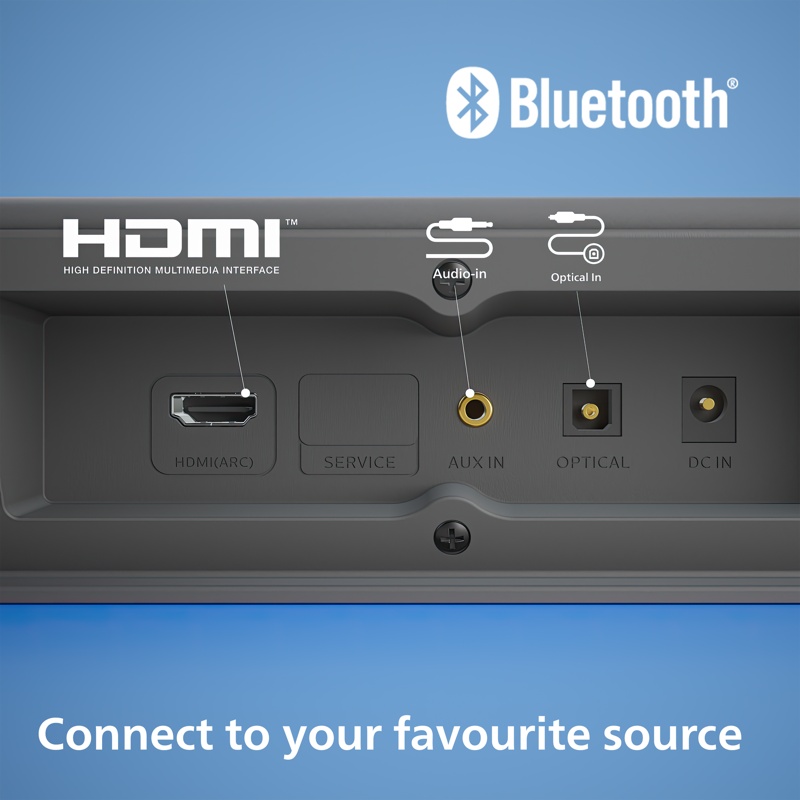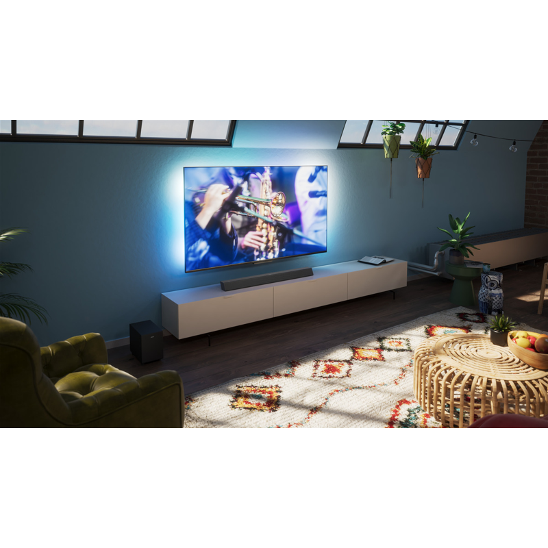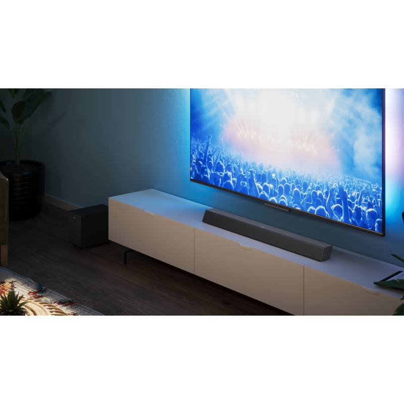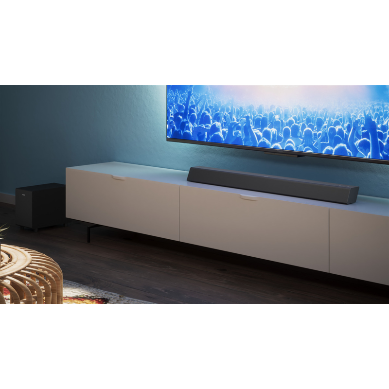 • 2.0-kanavainen soundbar langattomasti yhdistettävällä subwooferilla tuo voimakkaan ja selkeän äänen televisioosi