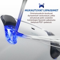 Langattoman DualSense-ohjaimen kosketuspalautteen ansiosta tunnet valikoiduissa PS5-peleissä tekemäsi toiminnot ohjaimen kautta. Valikoiduissa PS5-peleissä voit kokea lähemmäs pelejä vievät mukautuvat liipaisimet, joissa on dynaamiset, pelissä tehtäviä toimintoja simuloivat vastustasot.