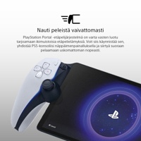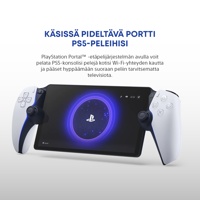 Huom. PlayStation Portal tulee olla yhdistettynä PlayStation 5 -konsoliisi, jotta voit etäpelata pelejäsi. PlayStation Portal:n käyttäminen edellyttää vähintää 5 Mb/s nopeuksista WiFi-yhteyttä. Parempaa pelikokemusta varten suositellaan vähintään 15 Mb/s:n nopeaa yhteyttä. Edellyttää PS5-konsolia ja PlayStation-tiliä. PS5-konsolilla on oltava internetyhteys, ja konsoli voi olla täysin käynnissä tai lepotilassa. Konsoli ja PlayStation Portal on yhdistettävä toisiinsa laiteparina.