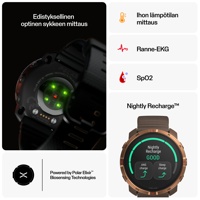 Polar Grit X2 on kompakti, lujatekoinen ja hyvin varusteltu outdoor-kello, joka on tukenasi niin suurissa seikkailuissa kuin jokapäiväisissä hetkissä. Sen edistykselliset treeni-, palautumis- ja biomittausominaisuudet on suunniteltu sulautumaan saumattomasti osaksi elämääsi, jotta saat itsestäsi kaiken irti missä ikinä liikutkin. Kirkas AMOLED-näyttö naarmuuntumiselta suojaavalla safiirilasilla pysyy terävänä ja selkeänä vaikeissakin sääolosuhteissa. Kaksitaajuuksisen GPS:n, värikarttojen ja yksityiskohtaisen reittiopastuksen ansiosta voit seurata sijaintiasi tarkasti. Jopa seitsemän päivän akunkesto yhdellä latauksella, ympärivuorokautinen aktiivisuuden ja palautumisen seuranta sekä intuitiivinen käyttöliittymä tekevät Polar Grit X2:sta täydellisen kumppanin kaikkiin seikkailuihisi.