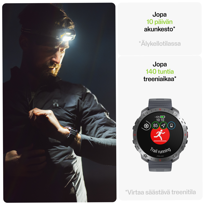 - Yhdellä latauksella jopa 43 tuntia treeniaikaa ja kellotilassa jopa 10 päivää