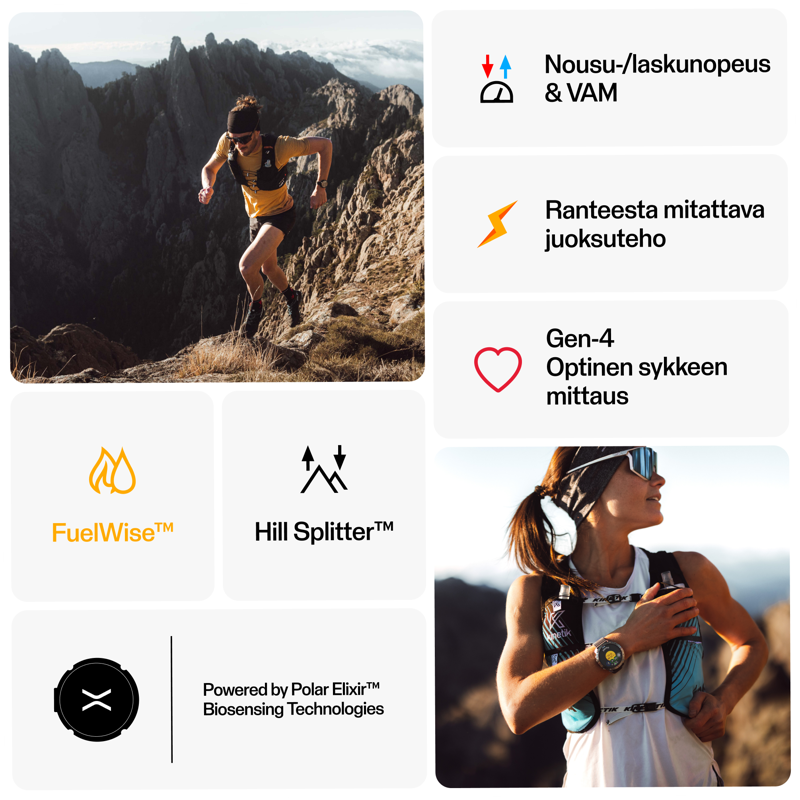 Pitkä akunkesto ja kattavat treeni -ja palautumistyökalut tekevät Polar Grit X2 Pro:sta täydellisen työkalun sekä ympäröivän maailman että oman suorituskyvyn rajojen tutkimiseen. Sisäänrakennettu Polar Elixir ‑biomittausteknologia seuraa kehosi reaktioita rasituksessa, jotta voit seurata suorituskykyäsi eri olosuhteissa. Edistykselliset ominaisuudet, kuten VAM, nousu- ja laskunopeus ja 3D-nopeus. Akunkesto treenitilassa 43 h, virransäästöominaisuuksilla jopa 140 h ja kellotilassa jopa 10 päivää.