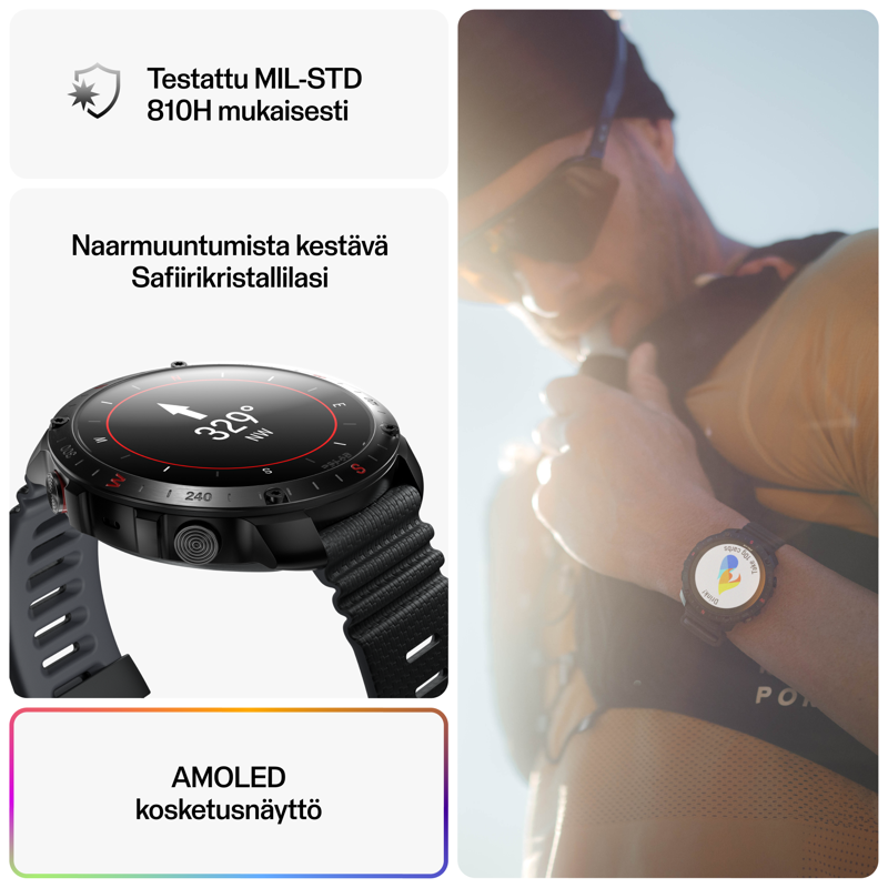 Polar Grit X2 Pro on suojattu naarmuja kestävällä safiirilasilla ja ruostumattomalla teräksestä valmistetulla kehyksellä. Urheilukellon kestävyys on testattu MIL-STD-810H-standardien mukaan.