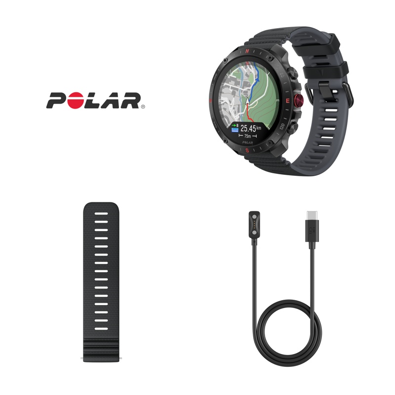 Polar Grit X2 Pro, S ja M/L koon rannekkeet, Polar Charge 2.0 ‑latausjohto USB-C-liittimellä, Käyttöopas, Tietolehtinen
