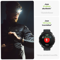 - Yhdellä latauksella jopa 43 tuntia treeniaikaa ja kellotilassa jopa 10 päivää