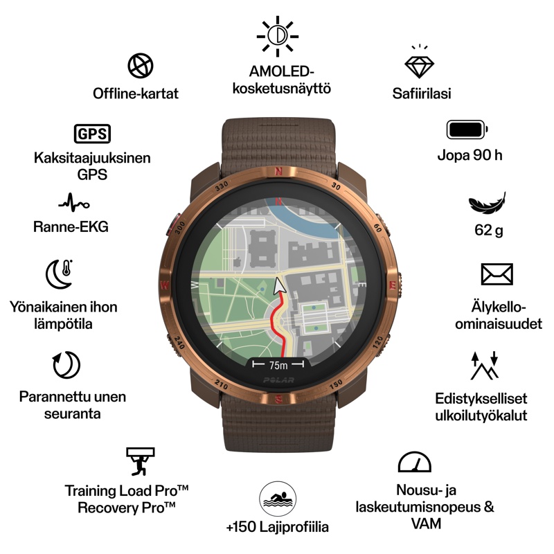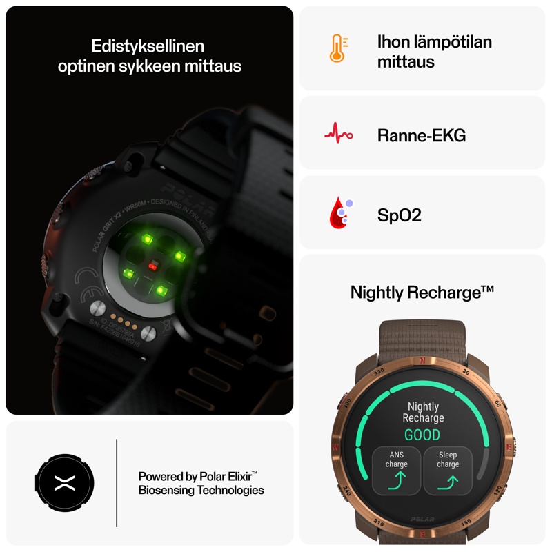 Polar Grit X2 on kompakti, lujatekoinen ja hyvin varusteltu outdoor-kello, joka on tukenasi niin suurissa seikkailuissa kuin jokapäiväisissä hetkissä. Sen edistykselliset treeni-, palautumis- ja biomittausominaisuudet on suunniteltu sulautumaan saumattomasti osaksi elämääsi, jotta saat itsestäsi kaiken irti missä ikinä liikutkin. Kirkas AMOLED-näyttö naarmuuntumiselta suojaavalla safiirilasilla pysyy terävänä ja selkeänä vaikeissakin sääolosuhteissa. Kaksitaajuuksisen GPS:n, värikarttojen ja yksityiskohtaisen reittiopastuksen ansiosta voit seurata sijaintiasi tarkasti. Jopa seitsemän päivän akunkesto yhdellä latauksella, ympärivuorokautinen aktiivisuuden ja palautumisen seuranta sekä intuitiivinen käyttöliittymä tekevät Polar Grit X2:sta täydellisen kumppanin kaikkiin seikkailuihisi.