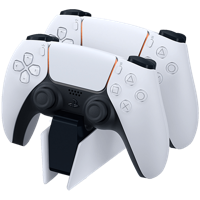 Lataa enintään kahta langatonta DualSense-ohjainta yhtä aikaa ja liitä ne nopeasti ja helposti latausalustan naksautusliitäntään. Ohjaimet latautuvat yhtä nopeasti kuin PS5-konsoliin liitettynä – voit vapauttaa USB-portteja latausnopeuden kärsimättä.