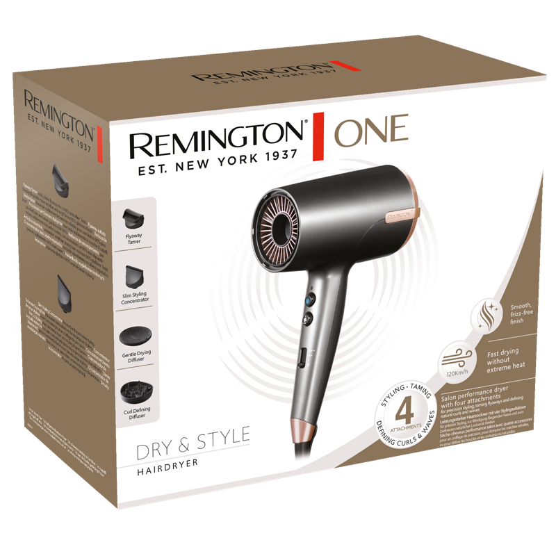Remington ONE Dry and Style -hiustenkuivaaja auttaa sinua saavuttamaan haluamasi tyylin neljällä lisäosalla, jotka on suunniteltu taltuttamaan irtohiuksia, silottamaan pörröisyyttä, erottelemaan kiharoita luonnollisesti ja nopeuttamaan kuivausaikaa.
