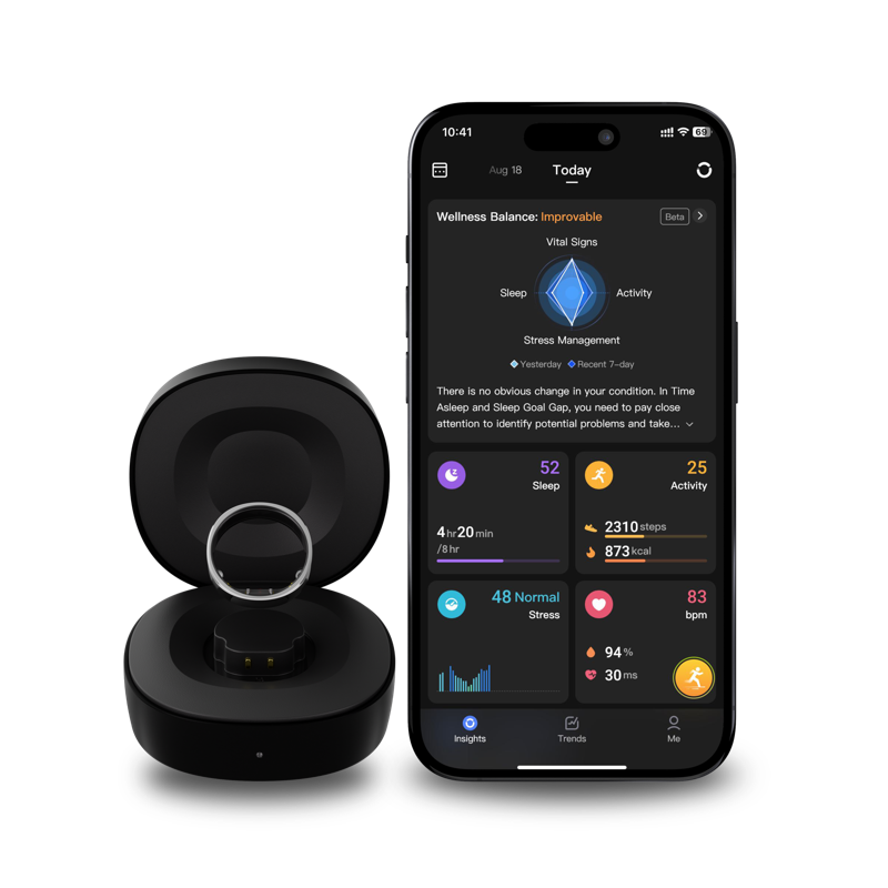 - iOS ja Android -yhteensopiva älysormus, joka mullistaa unesi ja kokonaisvaltaisen hyvinvointisi