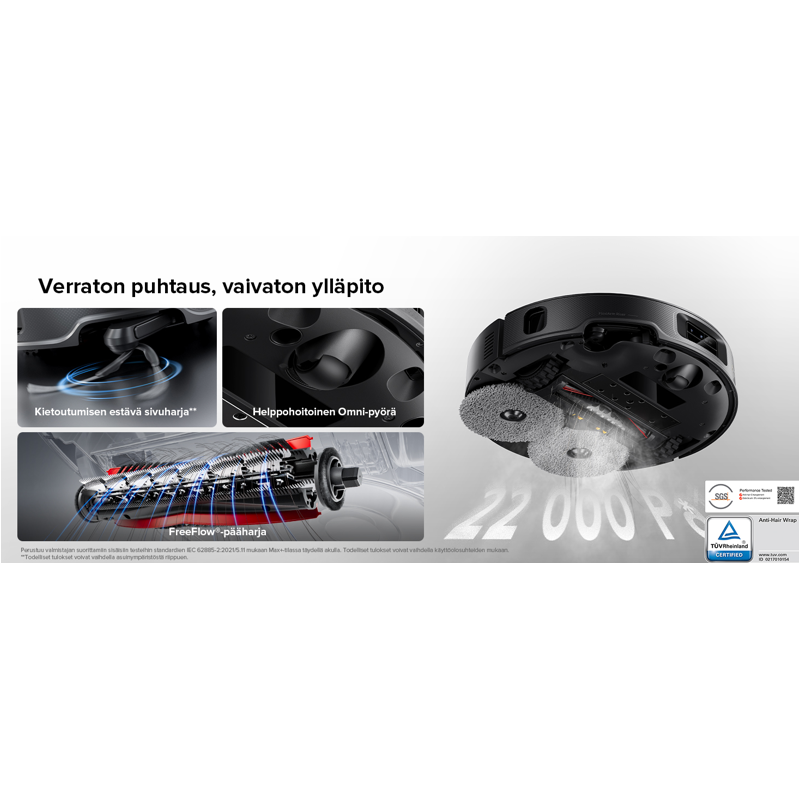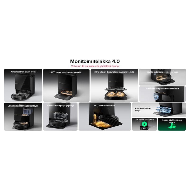 Vaivaton 10 ominaisuutta yhdistävä huolto. Automaattinen mopin irrotus, 2,5 tunnin pikalataus, 80 ℃ mopin pesu kuumalla vedellä, 80 ℃ telakan itsepuhdistus kuumalla vedellä, älykäs uudelleenpesu- ja moppaus, automaattinen pesuaineen annostelu, lämminvesisäiliön uudelleentäyyttö, automaattinen pölyn tyhjennys, 55 °C lämminilmakuivaus, irrotettava telakan pohja